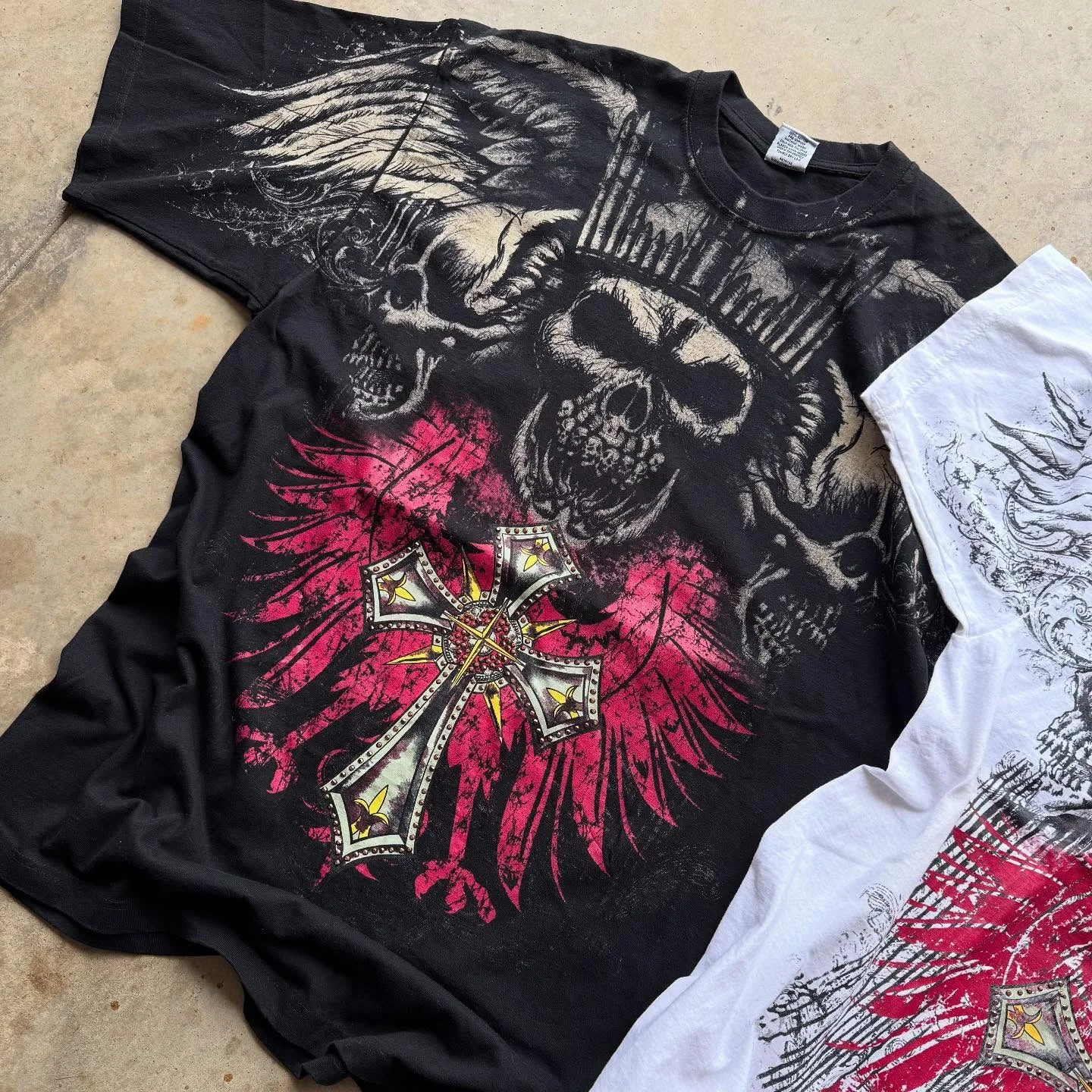 Hip Hop Multi-Element T-Shirt Mens American High Street Retro Loose Short-Sleeved Double-Sided Graffiti Printed Unisex Shirt